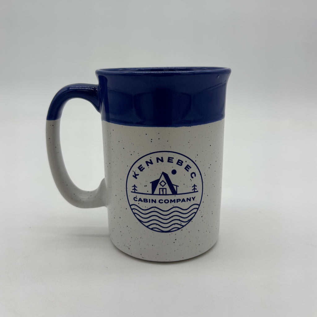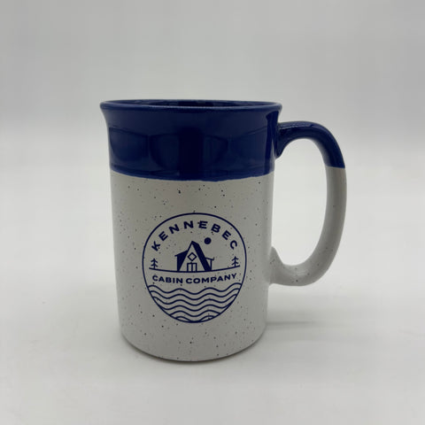 Two toned speckled 13 oz ceramic mug with Kennebec Cabin Company logo on both sides.
