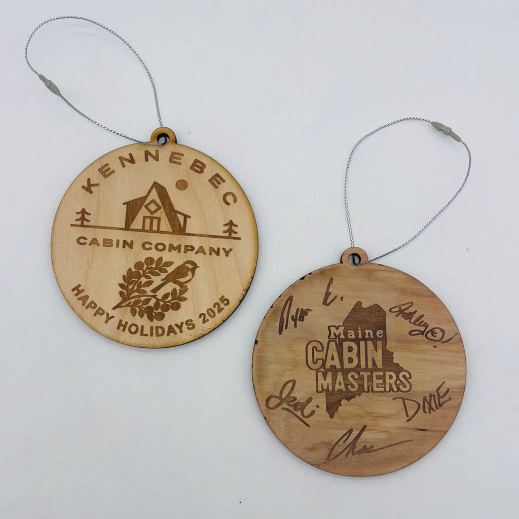 Alder wood ornament measures 3.5" around and features a sweet chickadee perched on bittersweet on the front as well as all of the Maine Cabin Masters signatures on the back.