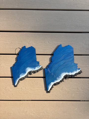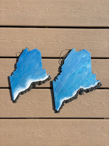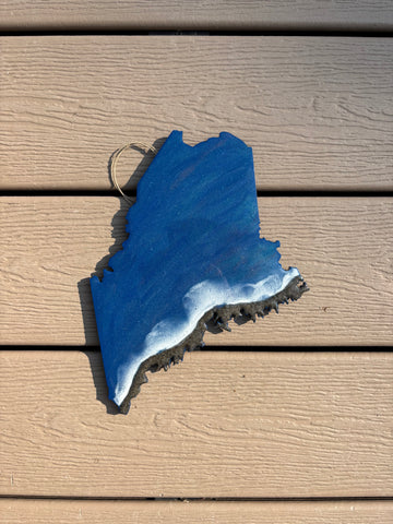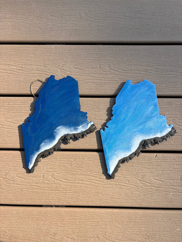 10" and 12" wooden Maine cutouts with hook for hanging, are decorated with real Maine beach sand and ocean blue colored resin.