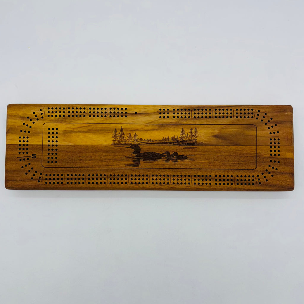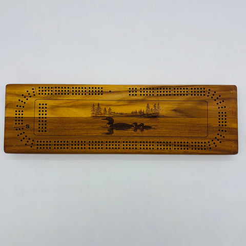 Rectangular wooden cribbage board. Measures 17"x5" Choose between a moose or a loon.